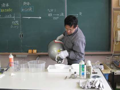 本時の最後の実験は、液体窒素による衝撃的な実験でした。窒素は−196度で液体になります。事前に液体窒素を準備し、入れ物に入れました。そこへビニールの柔らかいボールやきゅうりを浸しておきます。しばらくして衝撃を加えると、ボールは粉々になり、きゅうりはまるで木のような砕け方をしました。ボールが砕ける時の音はビニールとは思えないような爆発音でした。児童は目と耳で実感できましたので、液体窒素の低温の威力はきっと忘れないことと思います。
