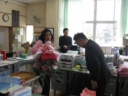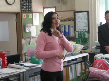 アニタ先生は、とても明るく、日本人の気持ちをとても理解してくださる素晴らしい先生です。インドから来日して5年。最初はとても不安だったそうです。高雄小は職員が仲間の一人として接してくれたので、とても居心地がよかったとおっしゃっていました。それから、日本人の日頃の仕事ぶりを見ていて、もう少しゆとりをもって仕事に取り組んだ方がよいと助言をくださいました。日本人はどうもあくせく働き過ぎに見えるようです。そういえば、インドの方の休日の過ごし方をお聞きした際に、上手に楽しむ方法をよくご存じでした。学ぶ事がたくさんある方でした。今までの熱心で暖かいご指導と、明るく思いやりのあるお人柄に感謝です。そして、さようなら。See you again.And good luck!
