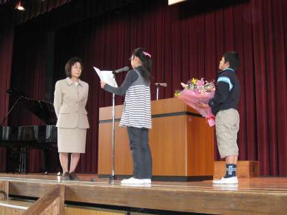 保浦先生は小澤先生の産休補充として、4の1の担任を勤めました。お話の抜粋です。「50年前この学校を卒業しました。まだ木造校舎でした。母校で先生をすることはとても楽しくて嬉しくて幸せでした。この学校に来て驚いたことが3つあります。1つ目は皆さんの座り方です。しっかり下におしりを付けて、立つ時も土をはらうことをしませんでした。2つ目は手洗いの様子です。蛇口の所に一列に並んで待つ姿に感心しました。3つ目は体育館に入場する際にシーンとして話し声が聞こえませんでした。スリッパの整とんもよく、素晴らしい学校だと思いました。卒業式の6年生の歌声や4年生の二分の一成人式の歌声、くすのき発表会の各学年の発表も素晴らしかったです。扶桑町に高雄小ありというくらいに立派な学校をつくっていってください」4の1の児童から感謝の言葉と花束が贈られました。