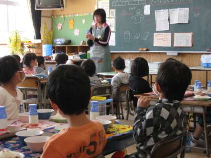 先生に牛乳の開け方などを教わり、いただきますをして、楽しく食べ始めました。