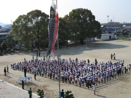 こいのぼりの下で朝礼が行われました。