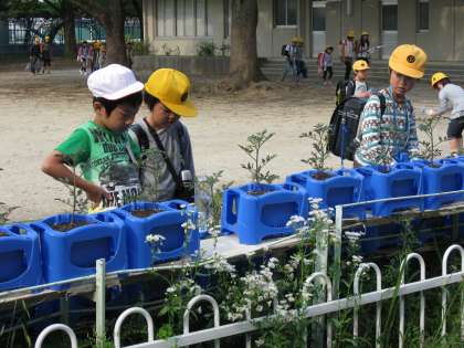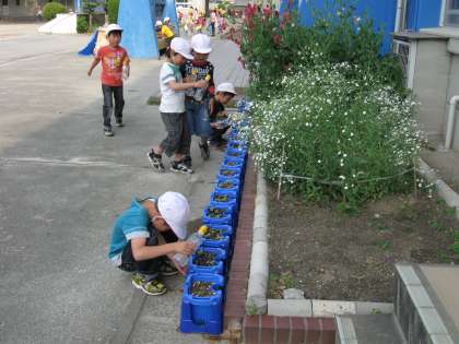1年生のアサガオ、2年生のミニトマトなど、各学年それぞれ植物を育てています。