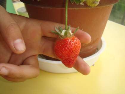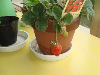 ふれあい学級の子どもが昨年より育てているイチゴが熟して、食べられるようになりました。いまのところ、1つぶだけです。