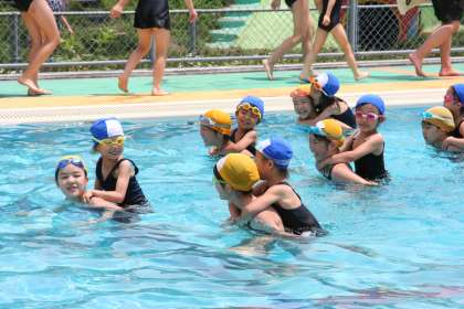 プールでは、6年生に手を引かれたりおんぶしてもらったりと、楽しく水に親しみました。また、6年生の上手な泳ぎを見せてもらいました。