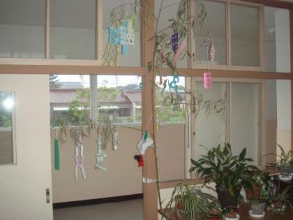 ふれあい学級で、七夕かざりをつくって、ねがいごとを書いた短冊とともに、かざりつけました。