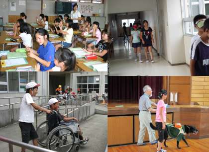 福祉実践教室として、手話・ガイドヘルプ・車椅子・盲導犬の4つの体験をしました。