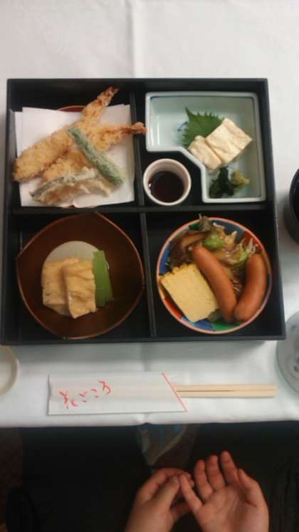 生湯葉のおさしみ。京都の味です。京野菜の炊き合わせ。てんぷら。そして、焼魚とウインナーです。