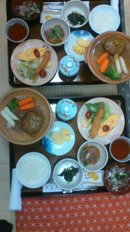 夕食は、カレー味のハンバーグ、えびフライ、オムレツ、肉ジャガ、茶碗蒸し、デザートです。