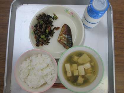 今日の給食のメニューは、ごはん、さばのみそ焼き、ひじきの炒り煮、豆腐のすまし汁、牛乳でした。