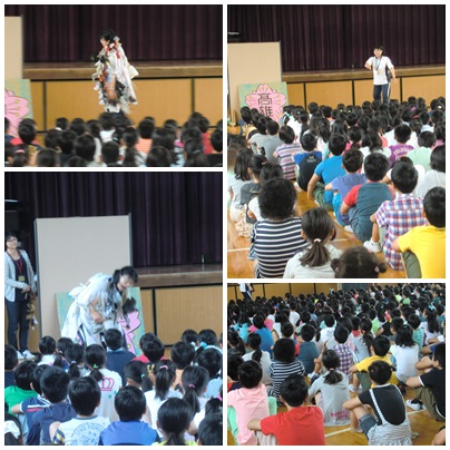 今朝は、はなはなさんによるミニ集会が行われました。5年生も2名、生徒役で参加しました。そして松野先生のみごとなダジャレ。「松野先生は校門で、ま・つ・の!」「奈良に鹿しかいない。まぁ〜角(つの)が…」