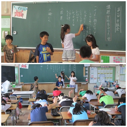 学級遊び係が、勝手にやりたい遊びを決めてしまうと、みんなが楽しめません。なので、学級会を開いて、やりたい遊びやルールを決めました。国語の学習で学級会のやり方を学んでおり、両クラスともスムーズな司会・進行ができていました。