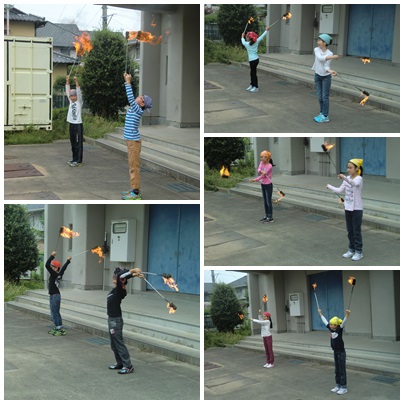 毎日、練習に取り組んできたファイヤーダンス隊。自宅でも練習に励んできました。手に豆を作りながらも頑張ってきました。今日は、実際に火をつけて練習をしました。「すごい音が出た」「こわかった」「重かった」と、これまでとは違う感覚を味わったようでした。本番の火の舞が楽しみです。