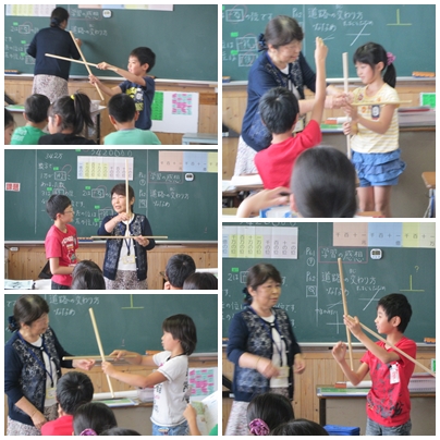 交わっている直線はどこにある?という先生の問いに対して、子ども達は2本の棒を使って前で発表しました。これから、垂直・平行についてどんどん学習していき、作図などにも取り組んでいきます。