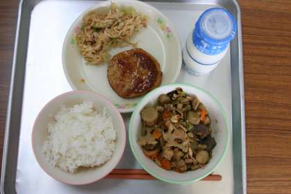 今日の給食のメニューは、、ごはん、ハンバーグのおろしソースかけ、はりはりあえ