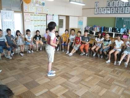 「いす取りゲーム」の勝ち残った子たちを代表して「アイム チャンピオン」ポーズを披露。みんな大笑い。続いて「何でもバスケット」を行いました。鬼になった子は,なかなかおもしろいことを言ってくれます。やっぱりみんなで笑うのは気持ちいいです。1時間たっぷり笑って楽しむことができました。これからも,チャレンジ目標を掲げ,みんなで励まし合って達成していきたいです。第2回のお楽しみ会は,いつできるかな?