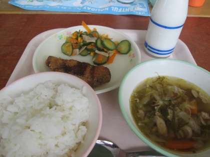 今日の給食は、ごはん 牛乳 サーモンフライ ハムサラダ 野菜スープでした。