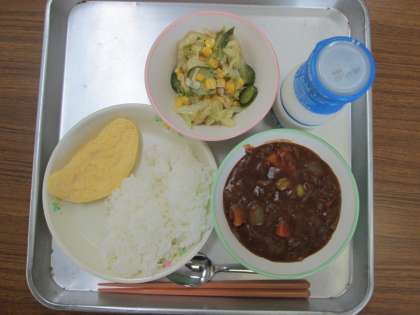 今日の給食のメニューは、夏野菜のハヤシライス オムレツ、コーンサラダ 牛乳 です。