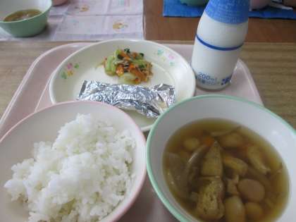 今日の給食は、ごはん 牛乳 さばの銀紙焼き チンゲンサイのなめたけあえ ふだま汁でした。