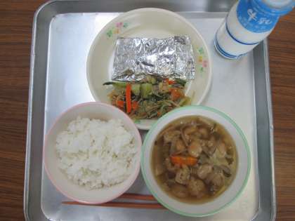 今日の給食のメニューは、ごはん、さばの銀紙焼き、チンゲンサイのなめたけあえ、ふだま汁、牛乳です。