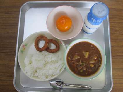 今日の給食のメニューは、お豆たっぷりハヤシライス、いかリングフライ、冷凍みかん、牛乳です。