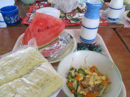 今日の給食は、冷やし中華 牛乳 ポテト重ね焼き すいかでした。