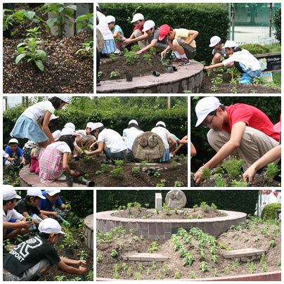 環境委員が中心となって考えた今年のメイン花壇は・・・テーマは「咲け!高雄のビッグフラワー!!」、デザインは、大きな大きな花のイメージです。赤サルビアが花びらの色で、力強さを表します。花の種類は、赤サルビアの他に、マリーゴールド、白サルビア。青サルビア、メランポジューム、アゲラタム、コリウスです。8月の中旬までは花を摘み、株を大きくします。秋には、ビッグフラワーがメイン花壇に咲く予定です。どうぞお楽しみに。