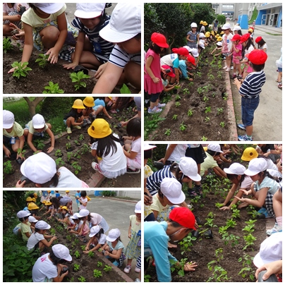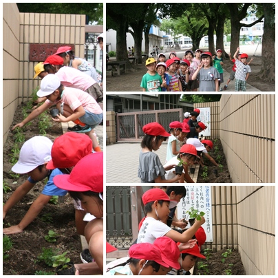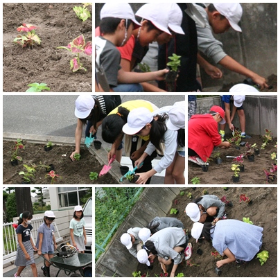 雨で延びていた定植でしたが、今日は、メイン花壇の横花壇を1年生のお花ボランティアさん、南門花壇を2年生のお花ボランティアさん、西花壇を6年1組さんに定植してもらいました。たくさんの苗がありましたが、進んで働く子ばかりで、あっという間に完了しました。これで、1年〜3年までは、お花ボランティアさん、4年〜6年までは、全員の子が花壇づくりに携わりました。全校で協力して種から育てた花が、秋にきれいに花開かせるのが今からとても楽しみです。