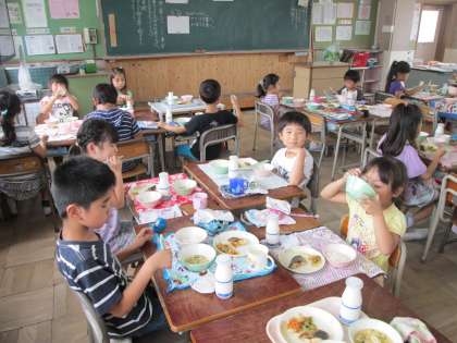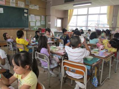 2−4では静かに給食を食べていました。でも、さすがにおかわりはむずかしいようでした。その中でも元気いっぱいの2人はかきたま汁をおかわりしてくれました。ありがとう!