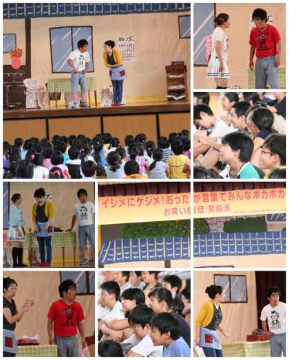 いじめは絶対にだめだよ、いじめを見かけたらすぐ先生に言うんだよ、という真剣な内容でしたが、爆笑につぐ爆笑の中に取り込んで、子どもたちにもよく分かるように演じてもらいました。