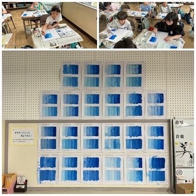 今日の図工は、グラデーションに挑戦しました。水で薄めていくパターンと、白に色を加えていくパターンの両方に取り組みました。「色が変わらない」「色が濃いから薄くしないと」など、各々につぶやきながら作成していました。教室の後ろに掲示すると「グラデーションになってる」「あの子のめちゃくちゃきれいにできてる」と感想を言っていました。これから絵を描く時に活用できたらと思います。