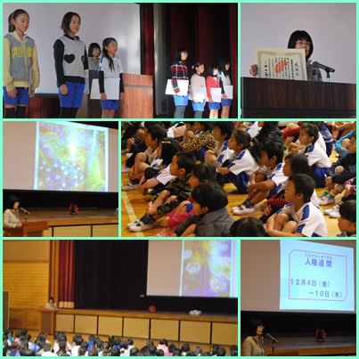 12月4日から10日は人権週間です。そこで,今日の話では,まず芥川龍之介の「蜘蛛の糸」を読みました。