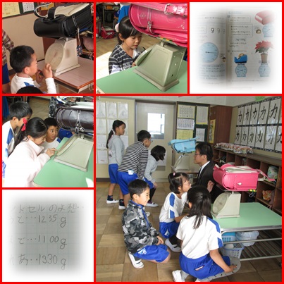 グループごとに順に全員のランドセルの重さを量りました。目盛りが0になっていることを確認したら,ランドセルを秤の台に載せ,目盛りを読みます。