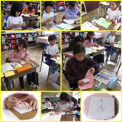 教科書の『しかけカードの作り方』という説明文を読んで,おもちゃまつりに招待する1年生への招待状カードを作っていました。