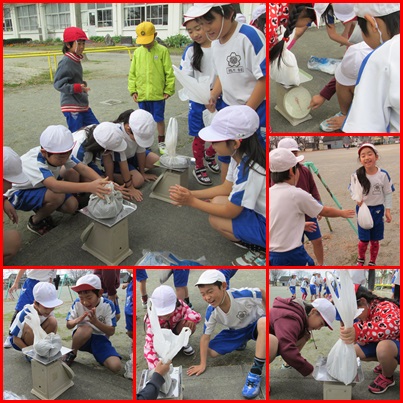 ポリ袋を持って砂場にやってきた3年生。早速グループで協力して,袋に砂を入れ始めました。