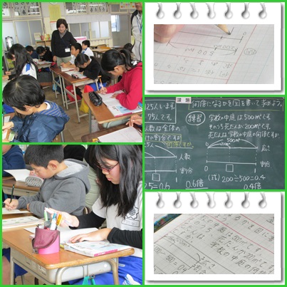 今日は割合を求める学習です。図をかいてみんなで例題を解いた後,例題に習って自分で図をかき,式を立てて,練習問題を解きました。