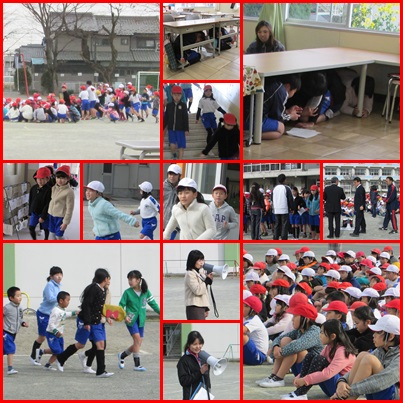 地震発生の放送が流れると,運動場で遊んでいた子たちはすぐに中央に集まり,しゃがんで頭を守りました。また,校舎内にいた子たちは,近くの教室の机の下にもぐりました。