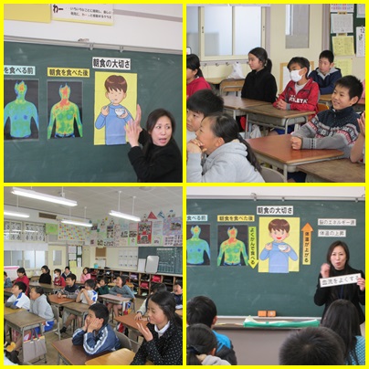 本日の給食終了後,栄養教諭の前田先生に「朝ごはんを食べると体にどんな変化が起こるか」というお話を聞きました。朝ごはんを食べるとよいということは知っていましたが,今日は何を食べるといいかも学びました。朝ごはんにたんぱく質を摂ることで,体温の維持等に役立ち,お昼まで脳も活発に動き,学習も運動もはかどるようです。一日の始まりの朝ごはんの摂り方を考えるよい時間になりました。