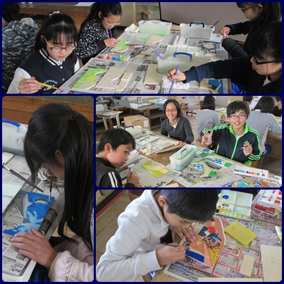 発色を良くするために、木目がすけるのを防ぐために、なるべく濃いめの絵具で塗り重ねました。和気あいあいと、色塗りを楽しむ6年生でした。