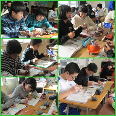 岩石見本を手に,見たり触ったり資料と見合わせたりし,