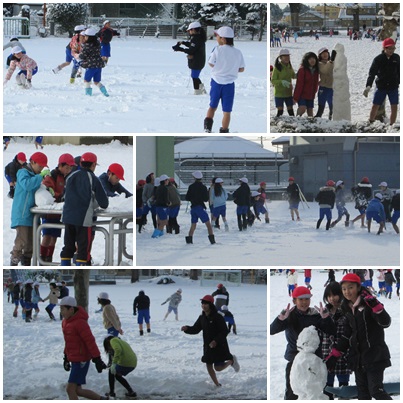 続いて出てきた6年生は,下級生が真新しい雪面で遊べるようにと,運動場の隅の方で遊び始めました。さすが,最高学年,山名小の優しいお兄さん・お姉さんたちです。
