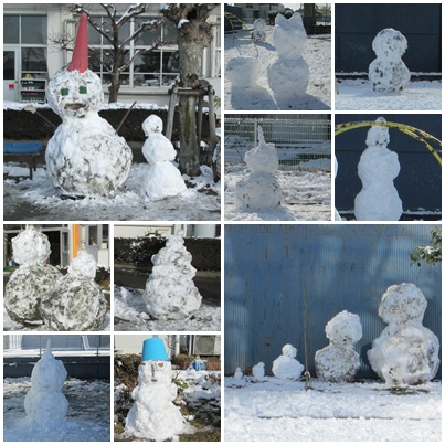 子どもたちが教室に帰った後,運動場の周囲にはさまざまな雪だるまが残されていました。