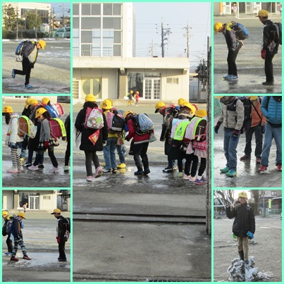 登校した子どもたちが,消え残った雪の固まりや凍った水たまりで遊びながら校舎へと向かっていました。