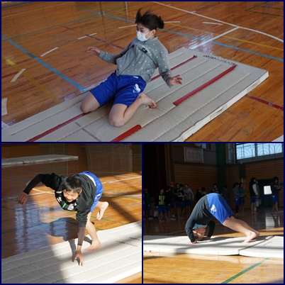 1組のマット運動では、「つなぎ」を意識しての連続技に挑戦しました。自分の定めた「キメ技」をより大きく、素敵に魅せるにはどういう技から、どうつなげたらよいかを意識して発表しました。また、台上前転への第一歩として、マットでの跳ね起きにも挑戦しました。大苦戦でした。