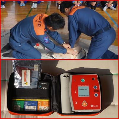 心臓マッサージ(胸骨圧迫)の仕方、AEDの使用方法を学ぶことができました。