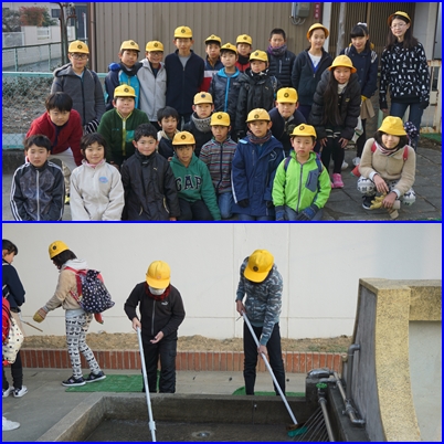 あいさつ隊のそばでは足洗い漕を保健委員が清掃していました。水を見るだけで寒くなりそうですが、毎朝一生懸命です。