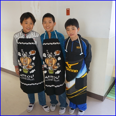 昼放課に廊下を歩いていると、エプロン姿の5年生を発見しました。聞くと、調理実習だそうです。がんばれ!!