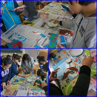 5時間目に、テープカッターのニス塗りを行いました。「片面ずつ塗らないと大変なことになるよ!」と互いに注意し合って進めました。窓際には、すでに出来上がった1組の作品が並んでいて、うらやましそうに見ている子もいました。