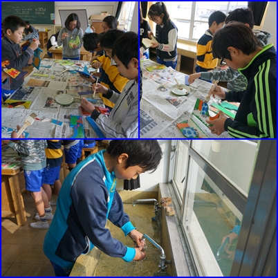 塗り終わったら片づけです。ニスを塗った刷毛は、しっかり洗わないと固まって使い物にならなくなります。「徹底的に洗ってね!」と言われ、水道水でしっかり洗う姿が印象的でした。終わった後は、「うおー!手がつめてー!!!」ですって。最後までありがとね。