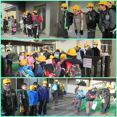 東門では,6年生と一緒に4年生のあいさつ隊も並んでいます。東脱履を利用している4年生。門に立っている6年生を見て,校舎に入る前に一緒にあいさつをするようになったようです。