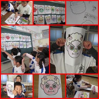 今日は学活の時間に各クラスで、自分のいいところ・自分の直したいところを振り返り、鬼のお面を作りました。最後は「おにはそと!ふくはうち!」と豆まきの練習をしました。